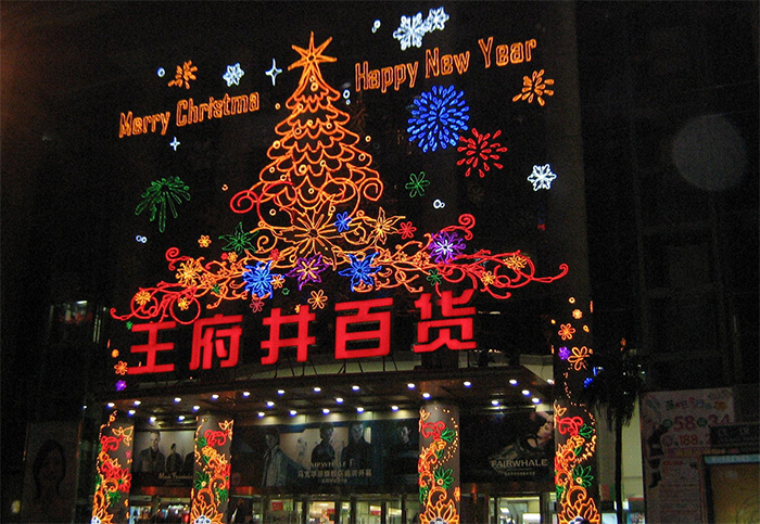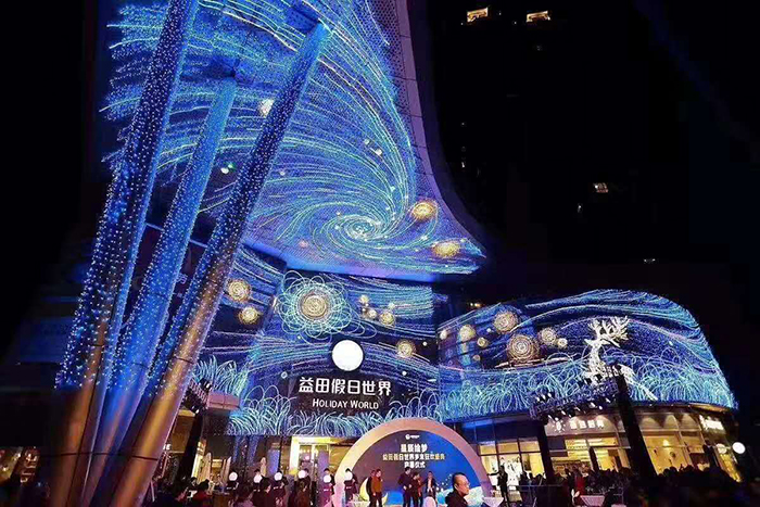 商場外墻搭配商場外面的空間同進行亮化處理,效果可能會更好,當(dāng)然這是建立在商場外面具有足夠的空間的前提下。例如商場的廣場上搭配使用具有節(jié)日氣息的燈光造型,使商場節(jié)日氛圍更加濃烈,從而為顧客營造一種更加舒適、歡快的購物氛圍。